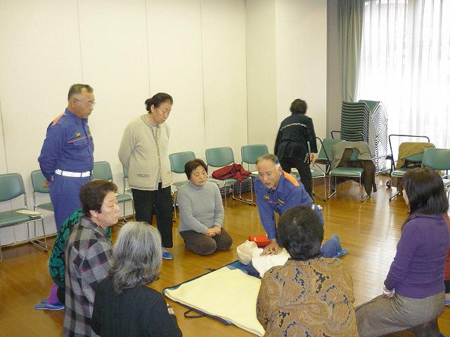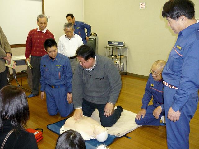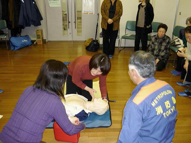 講師は世田谷消防署救命士の小山さんが行い、12分団員は胸骨圧迫による心臓マッサージとAED訓練機を使用して実技指導を行いました。