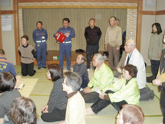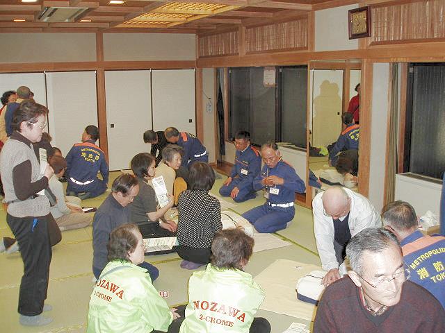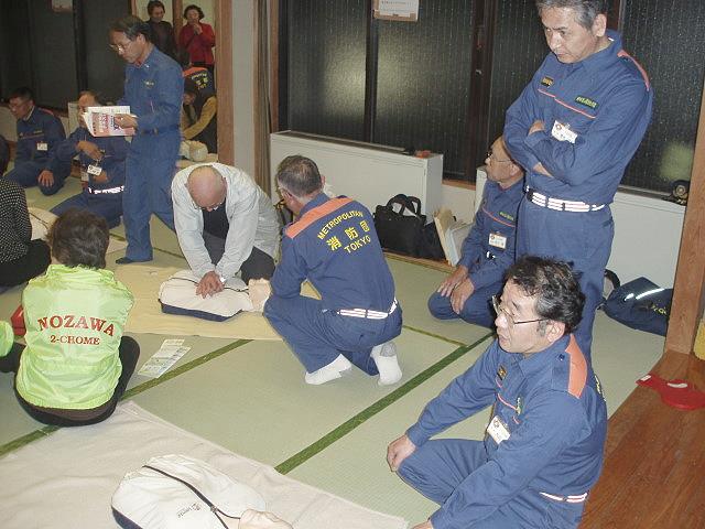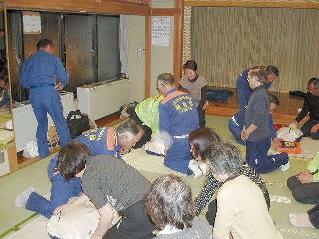 講師は世田谷消防署の秋葉主任が行い、12分団員はそれぞれ5体の人形に付き参加者の皆さんに、胸骨圧迫による心臓マッサージとAED訓練機を使用して実技指導を行いました。