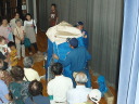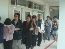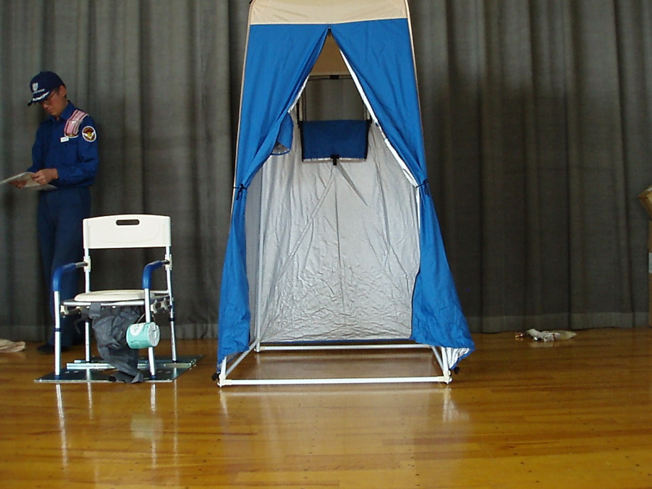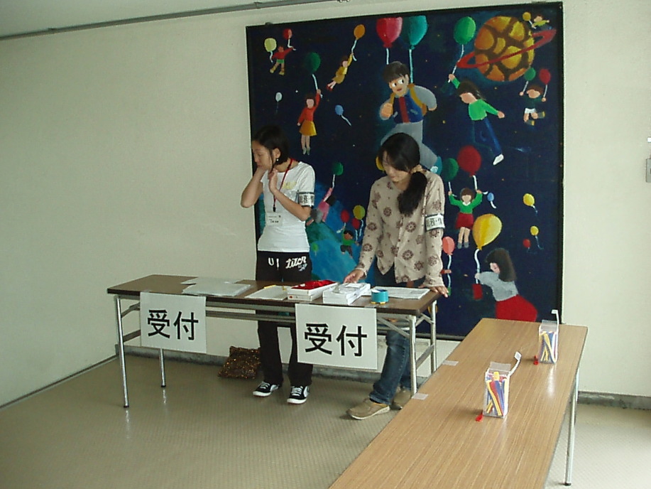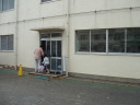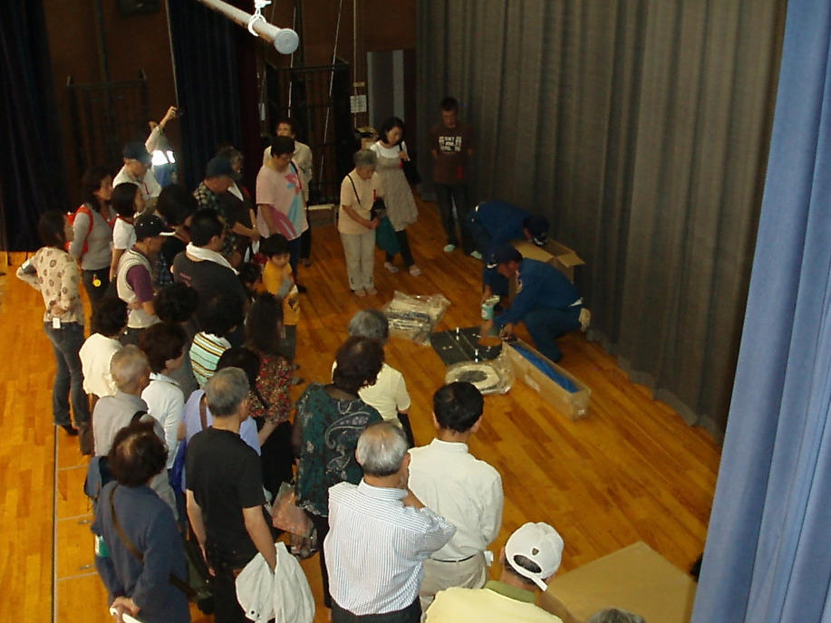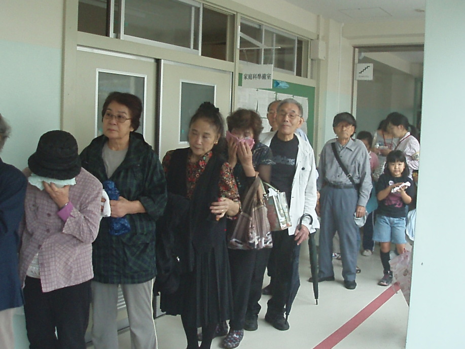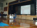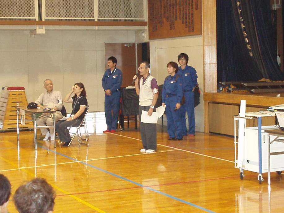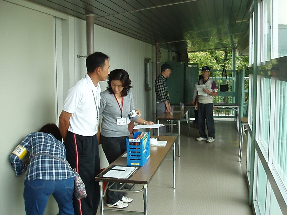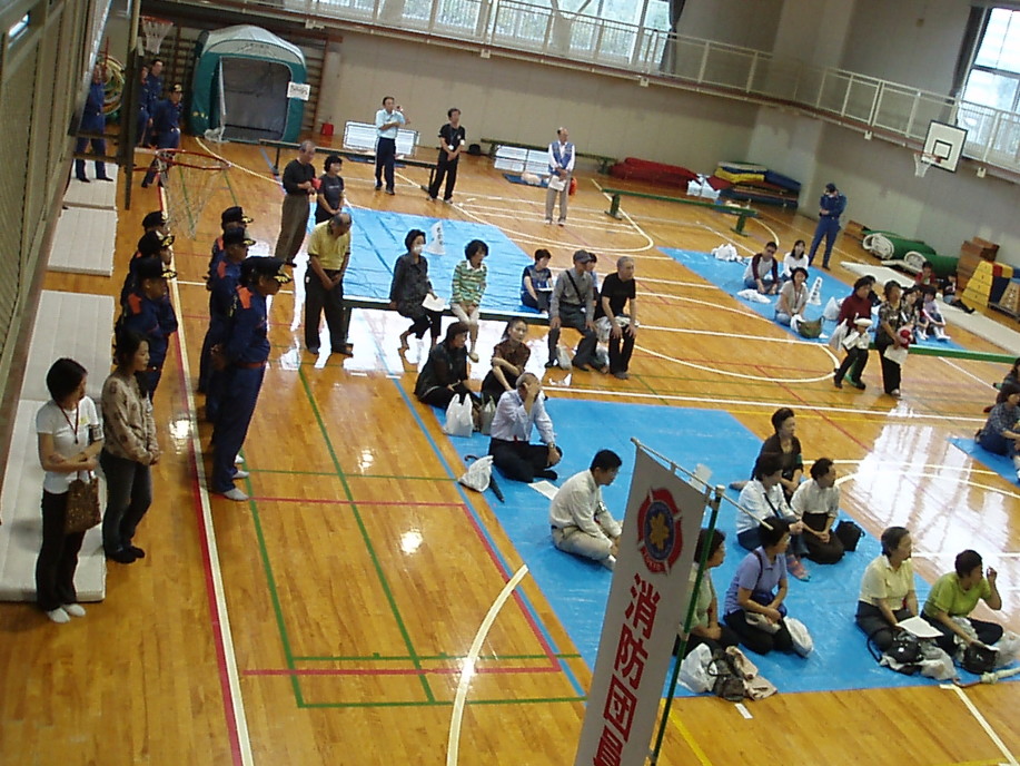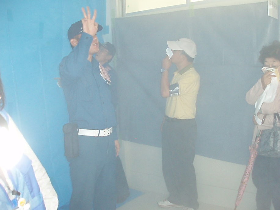 参加者は正門を入り校舎右側の入り口から入り、煙中体験訓練。そのまま校舎中を通って体育館入り口にて災害時の受付訓練を済ませ体育館の中へ。