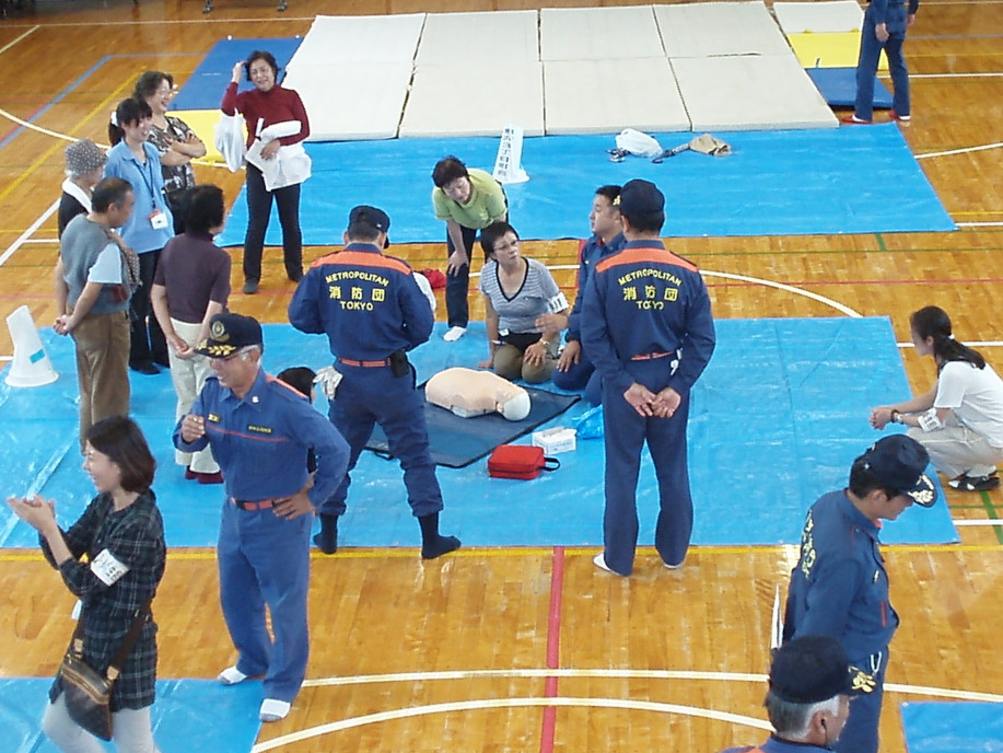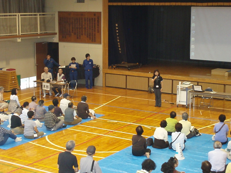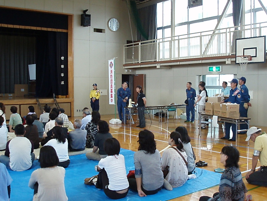 野沢3丁目町会町内海様の訓練開始宣言の後、世田谷区職員の方の東日本大震災の避難所の現状報告後、訓練を開始。