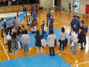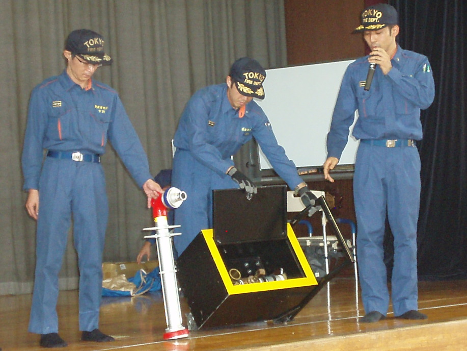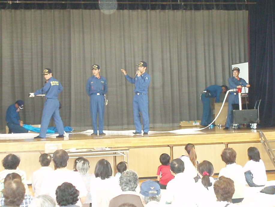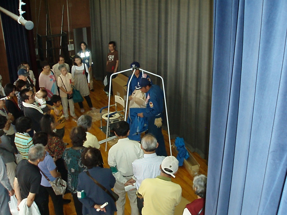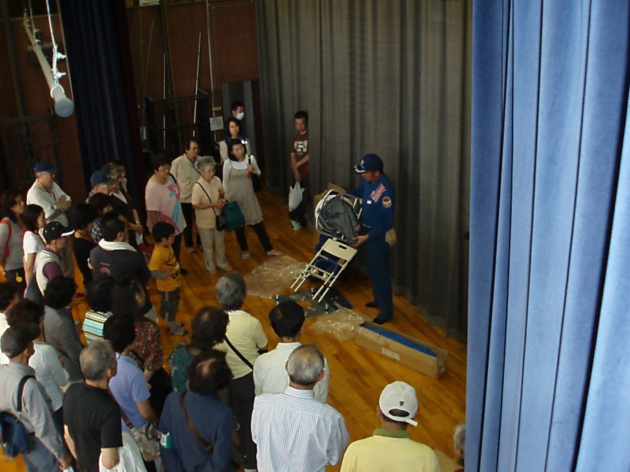 この日はあいにくの雨で、雨天時用のスケジュールに変更され、資機材の操作訓練、スタンドパイプの放水体験は中止、体育館内を活用した訓練が行われました。