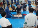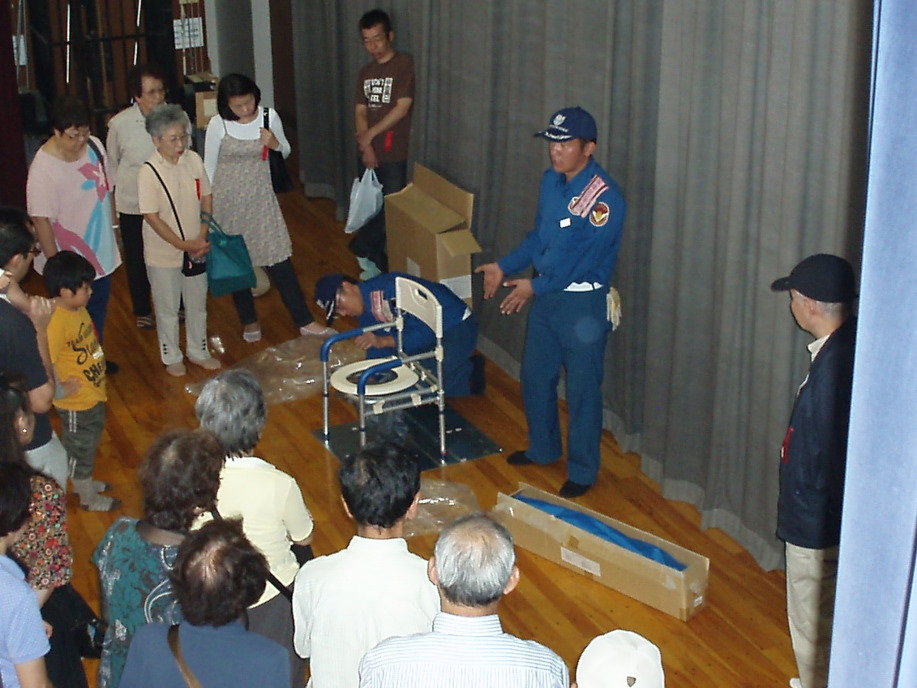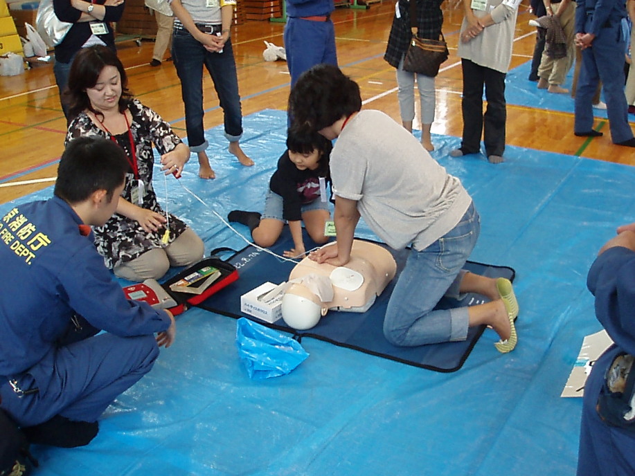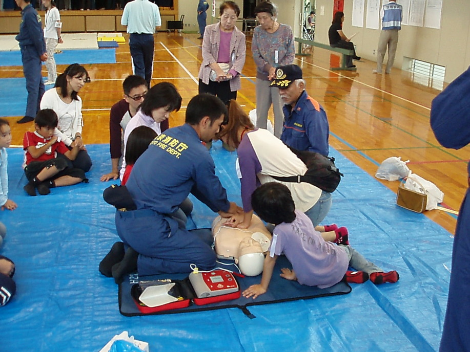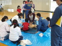 2班に別れ応急救護訓練(心臓マッサージとAED操作)と、マンホールトイレ設置訓練。消防署員によるスタンドパイプ操作説明。
