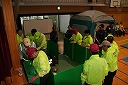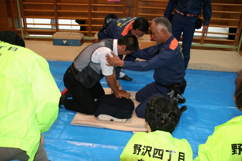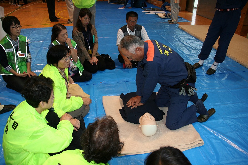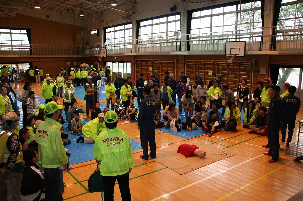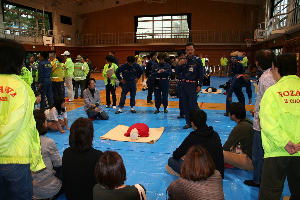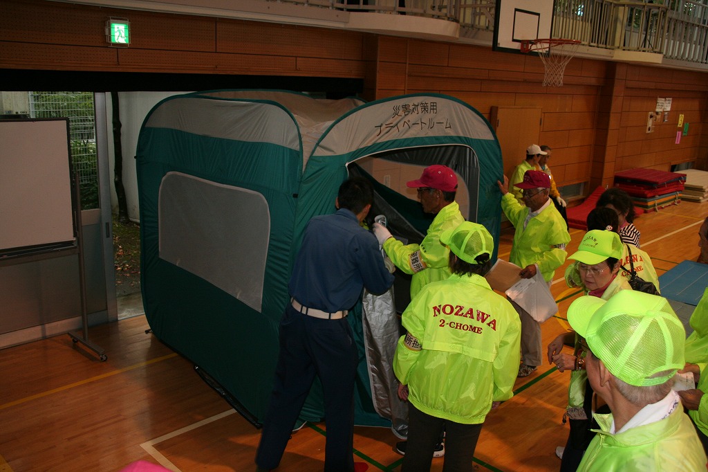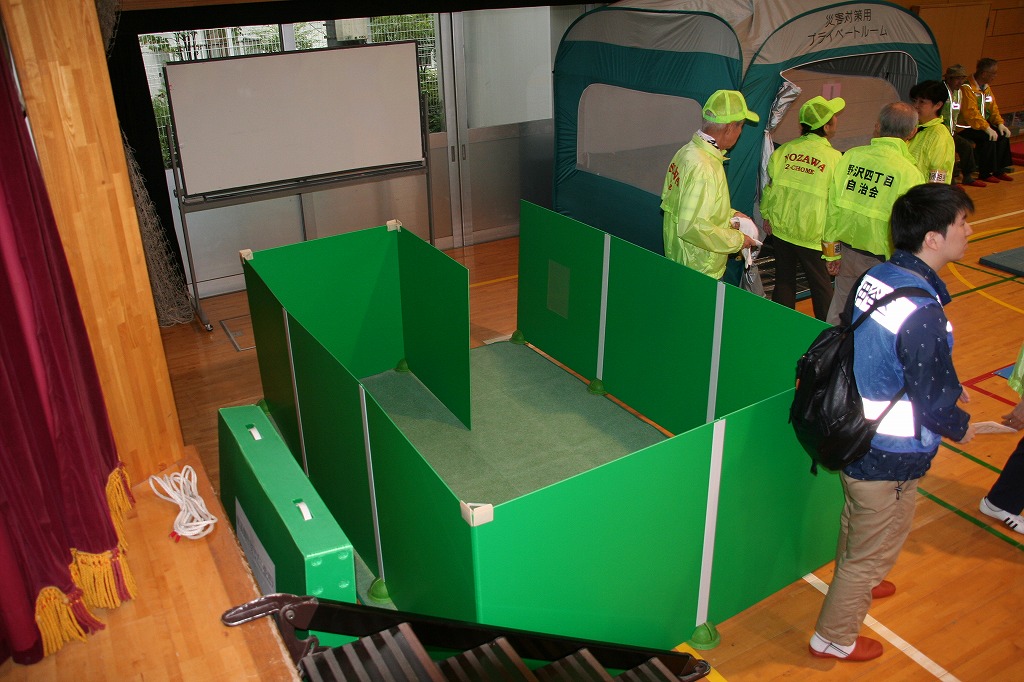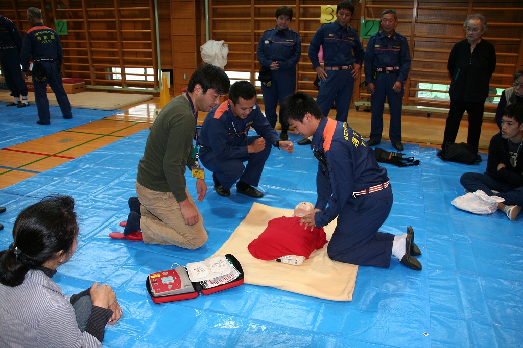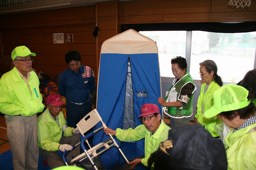 訓練内容は、避難所参集受付訓練、簡易トイレ組立、簡易パーテーションの組立、AEDによる応急救助訓練が行われ、限られたスペースを有効に使って効率の良い訓練が出来ました。
