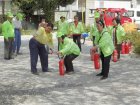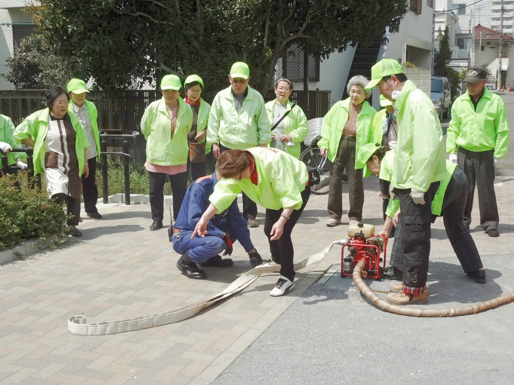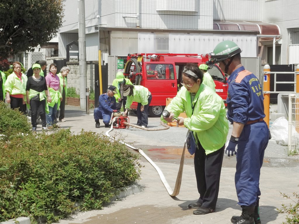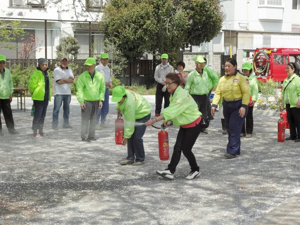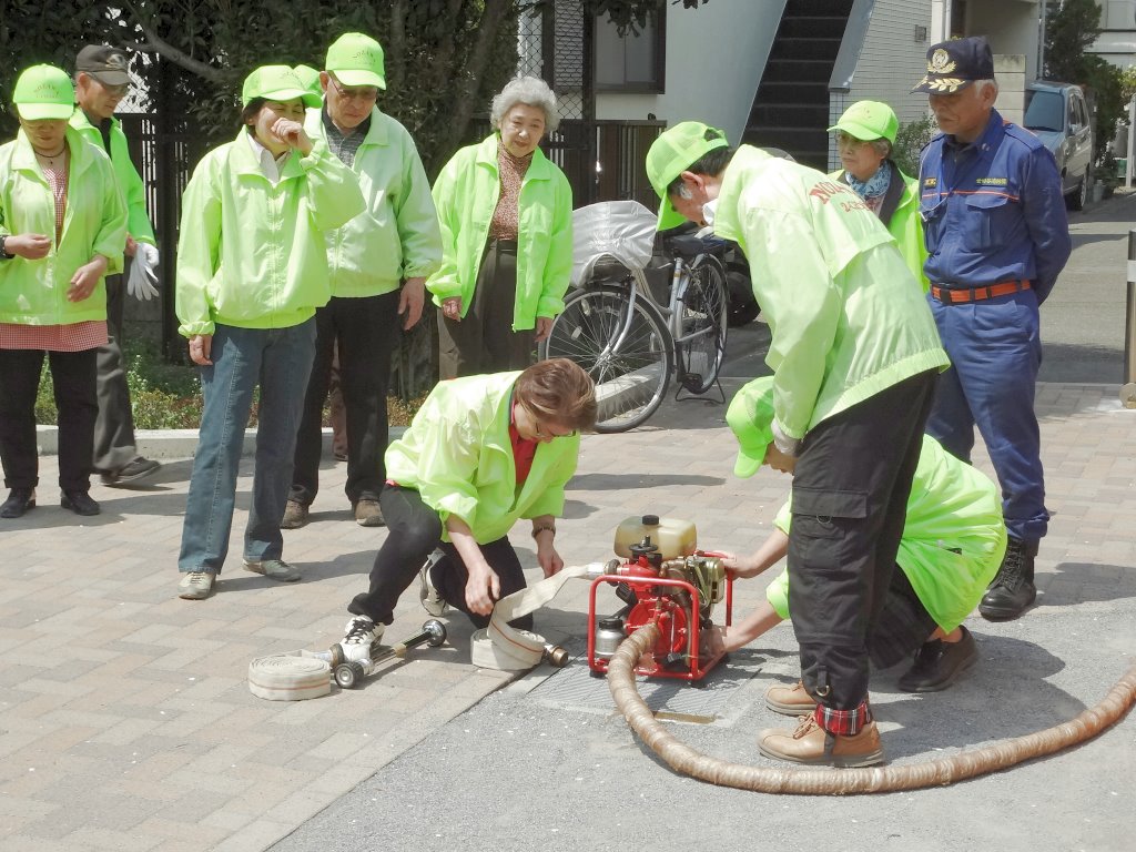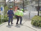 訓練は最初に区の職員さんの指導で消火器による初期消火訓練。次に12分団の指導でD級ポンプを使った消火訓練を行いました。