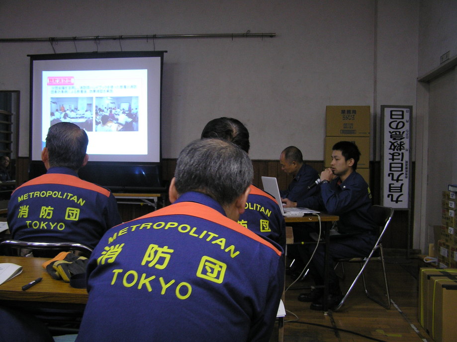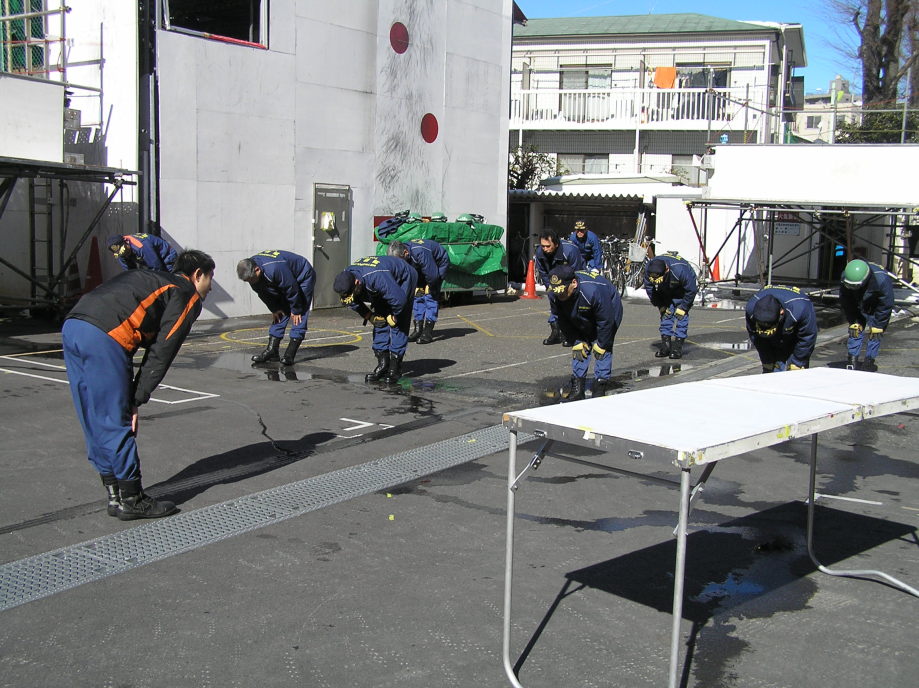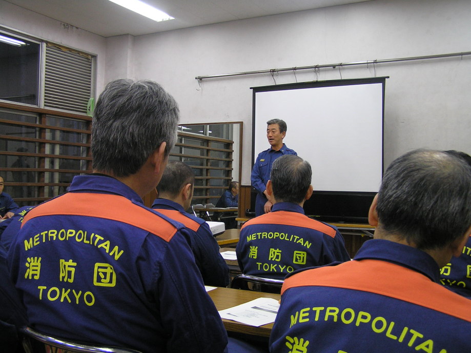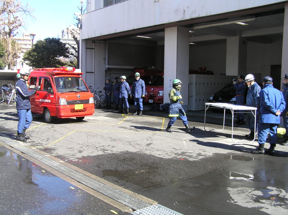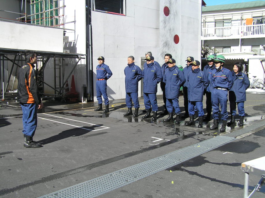 災害活動強化訓練の最終回は世田谷消防署にて行われました。当初、訓練は消防学校(渋谷区西原2丁目)にての実施予定でしたが、前日までの記録的な大雪のため三軒茶屋の世田谷消防署にて実施されました。日曜にも関わらず署長をはじめ署員、団本部の方々の出席をいただきました。