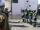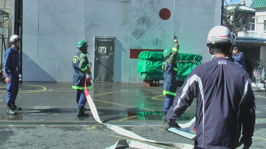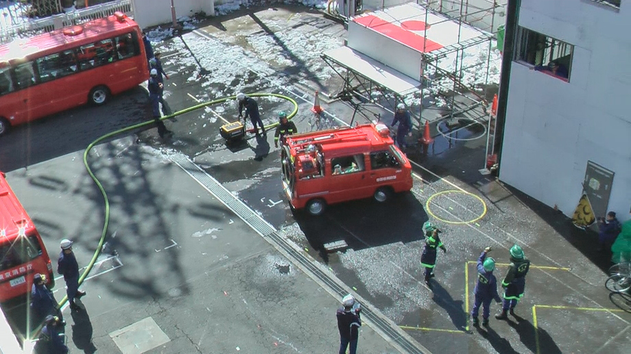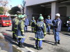 午前中の講義は、消火栓の雪かきの疲れも残っているにも関わらず団員たちは、話しに聞き入っていました。午前の実技訓練は火災現状に消防隊の後に到着してからの活動要領と消火訓練(通常火災を想定)。午後の実技訓練は、消防隊より先に現着したと設定しての消火活動訓練(震災時を想定)。4人1組の班での訓練です。事前に設定を説明されているのですが、実際に対処・実行には苦労しました。頭で考えていることの半分もできないことが多々ありました。
