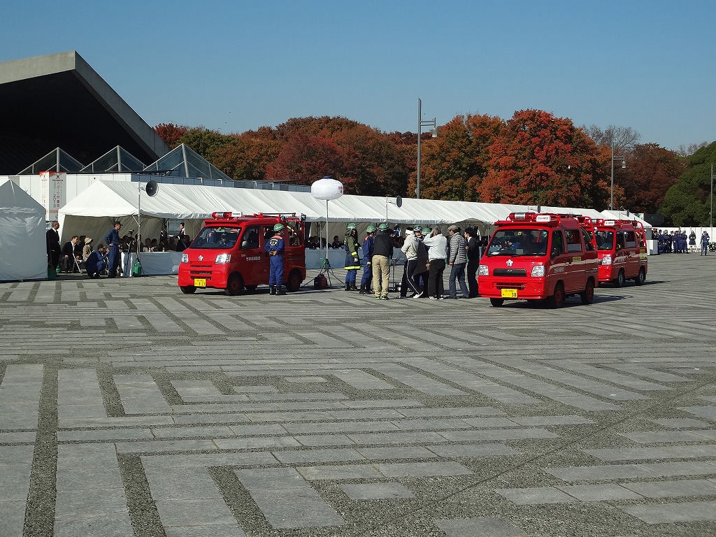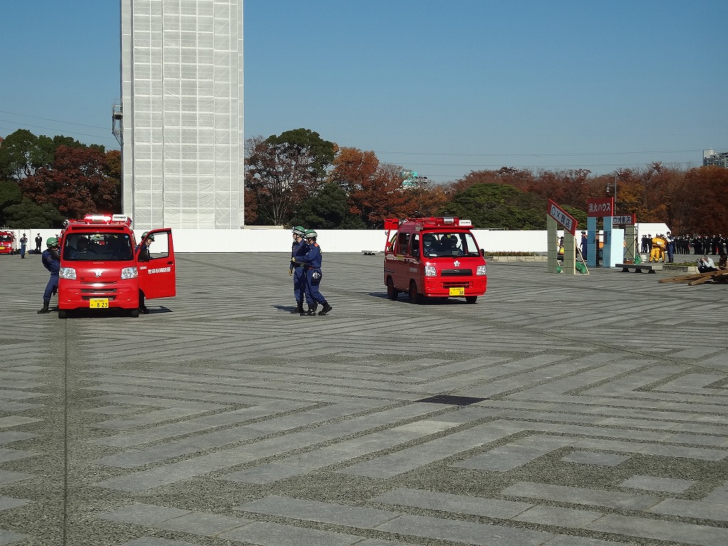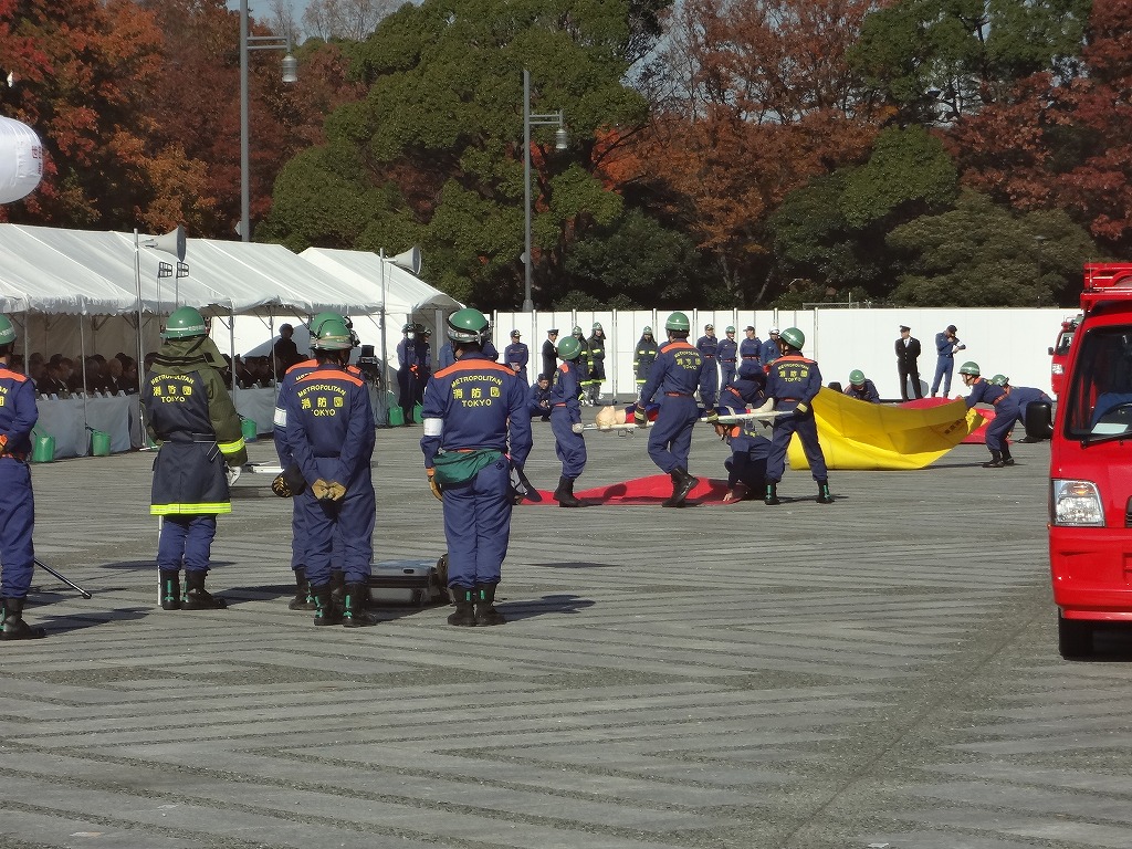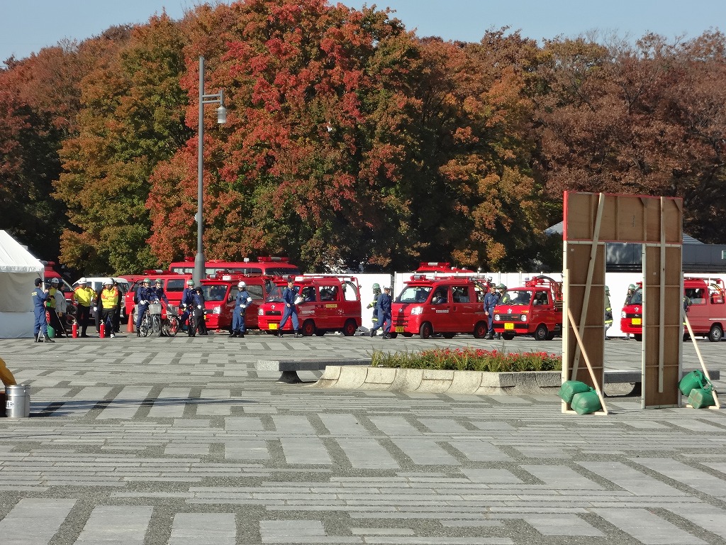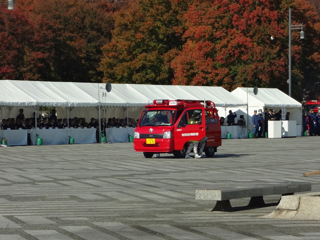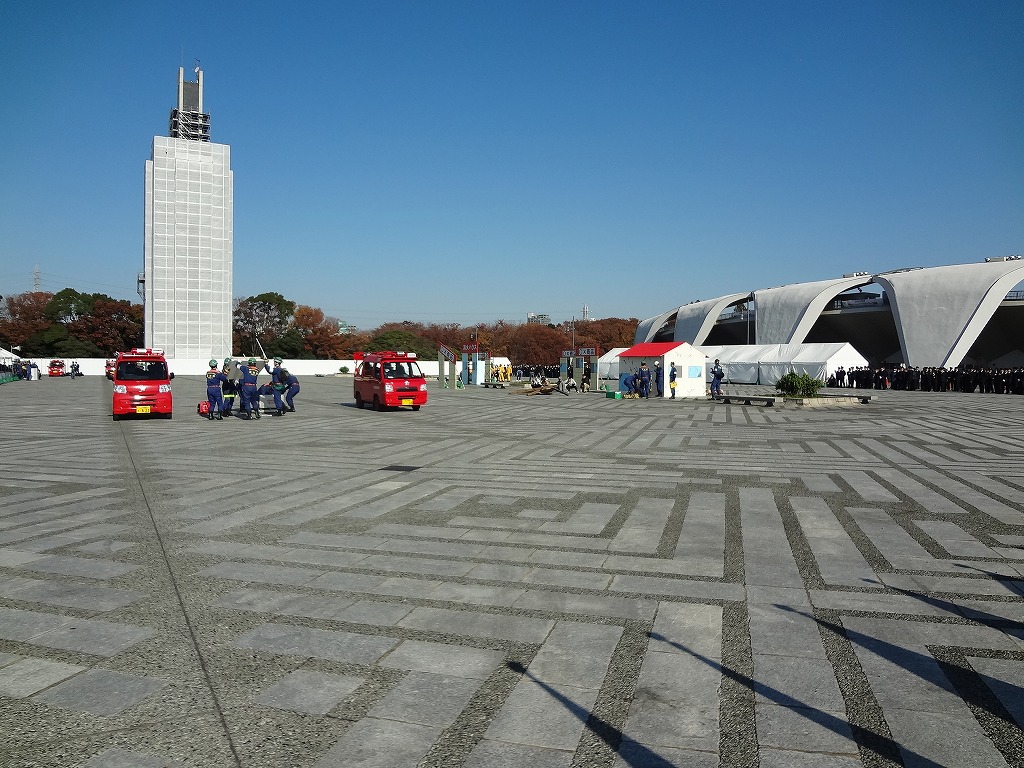 11月23日(日)駒沢オリンピック公園中央広場で世田谷区内消防団の三団合同点検が行われました。世田谷区内には、世田谷・玉川・成城の3つの消防団があります(私たち12分団は世田谷に所属しています)。その3つの消防団の全消防団が年1回集合して、世田谷消防署長や世田谷区の保坂区長をはじめ来賓の方々の前で規律訓練や救助・消火活動等のデモンストレーションを行います。