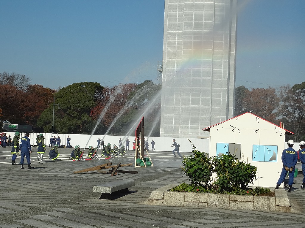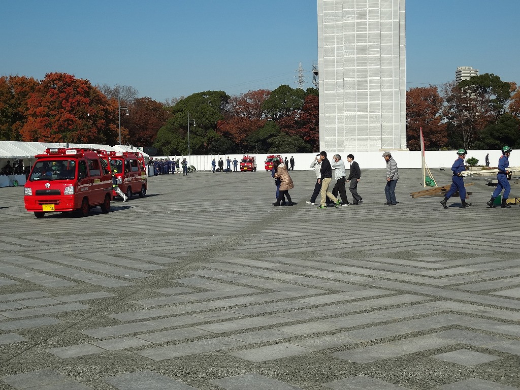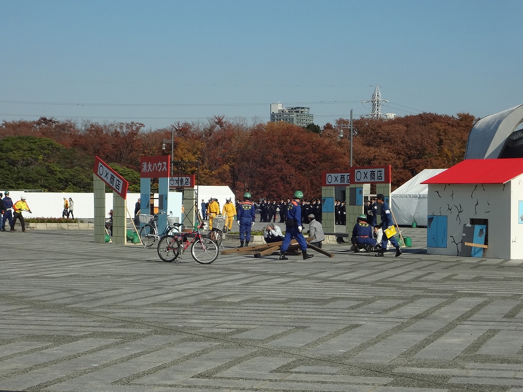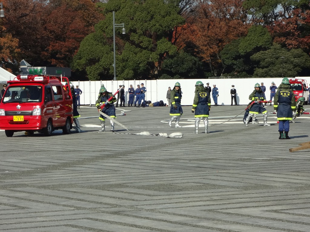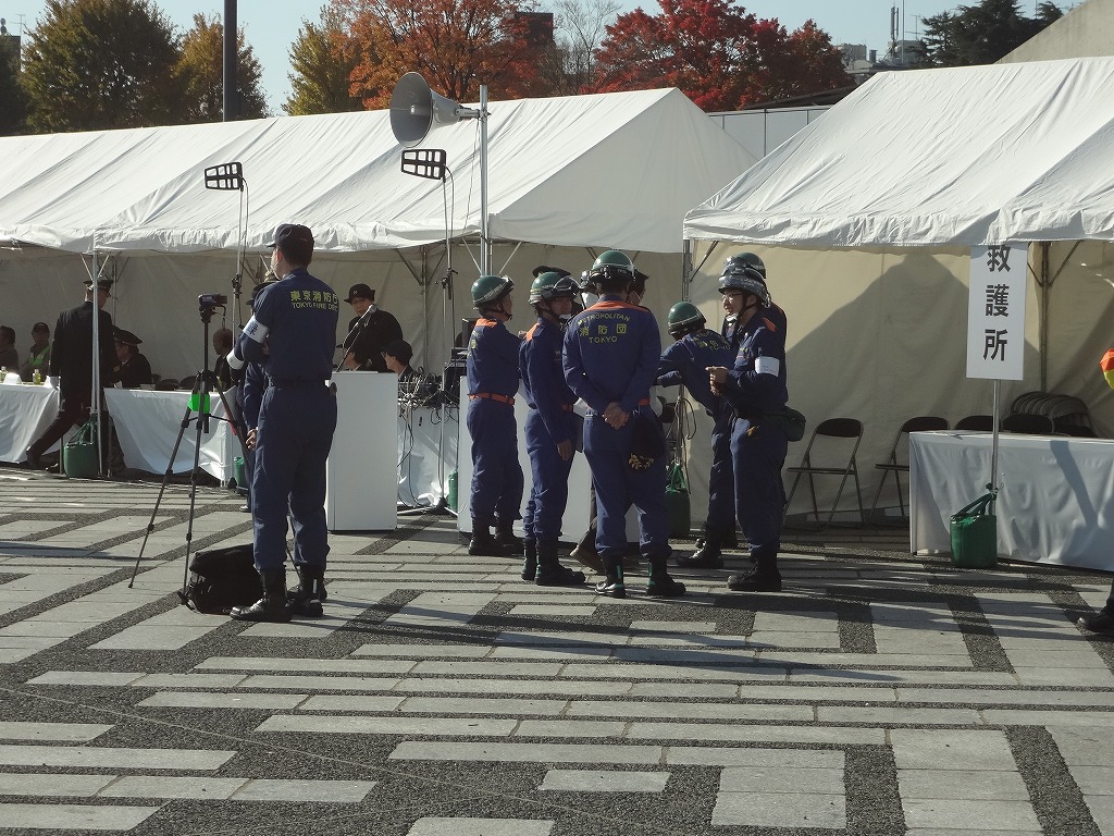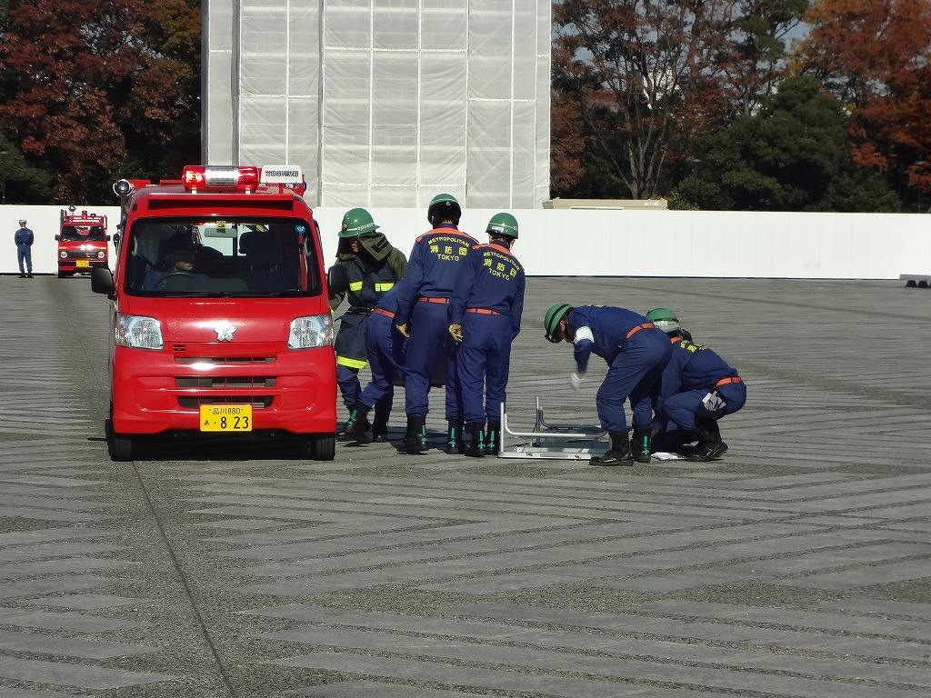 11月23日(日)駒沢オリンピック公園中央広場で世田谷区内消防団の三団合同点検が行われました。世田谷区内には、世田谷・玉川・成城の3つの消防団があります(私たち12分団は世田谷に所属しています)。その3つの消防団の全消防団が年1回集合して、世田谷消防署長や世田谷区の保坂区長をはじめ来賓の方々の前で規律訓練や救助・消火活動等のデモンストレーションを行います。