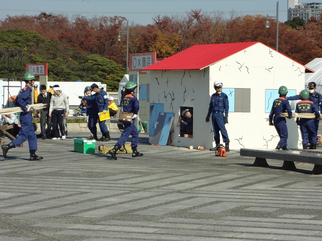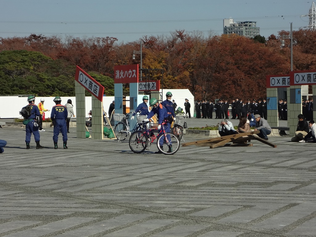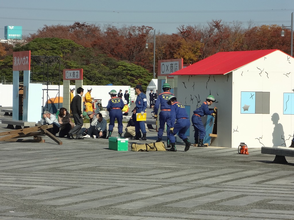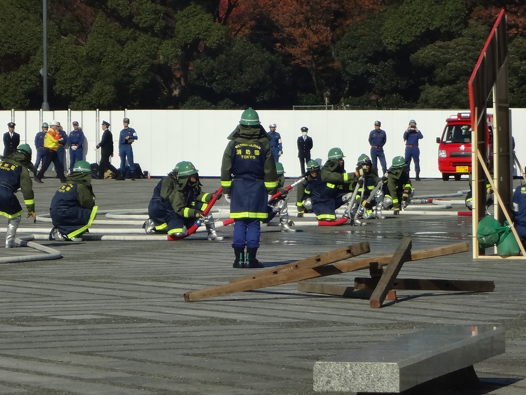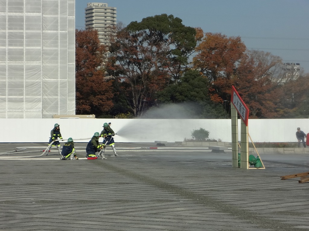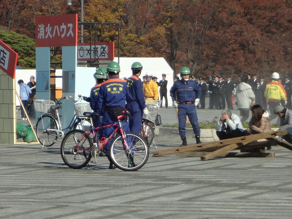 11月23日(日)駒沢オリンピック公園中央広場で世田谷区内消防団の三団合同点検が行われました。世田谷区内には、世田谷・玉川・成城の3つの消防団があります(私たち12分団は世田谷に所属しています)。その3つの消防団の全消防団が年1回集合して、世田谷消防署長や世田谷区の保坂区長をはじめ来賓の方々の前で規律訓練や救助・消火活動等のデモンストレーションを行います。