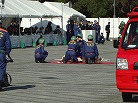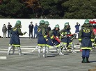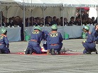 ここ数年立て続けで消火活動のデモを指名されている12分団は、今年も消火活動のデモンストレーションを担当しました。今年は7分団と連携しての消火活動。7分団がこの点検用に設置された水槽の水利から吸水をして、12分団がその水を受けて消火をするという例年の単純な消火活動訓練の上をいく『中継遠距離放水』という指令でした。実は私たち、この2週間前にこのような訓練をしていて指令に対する理解度や動きなどカンペキ!な12分団の誇る団員たちが活躍してくれました。ただ放水の際に7分団からの水圧が低くて、放水の放物線がイマイチで残念。7分団さんとの連係が上手く図れず、今後の反省材料もいただいた合同点検でした。