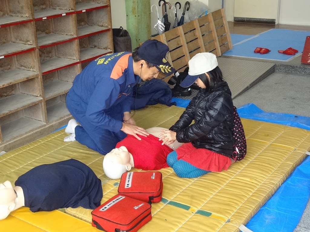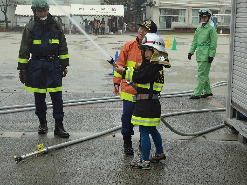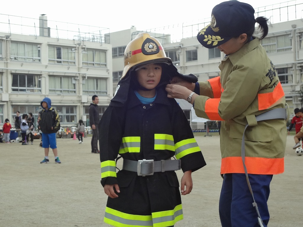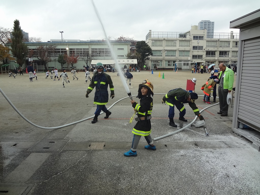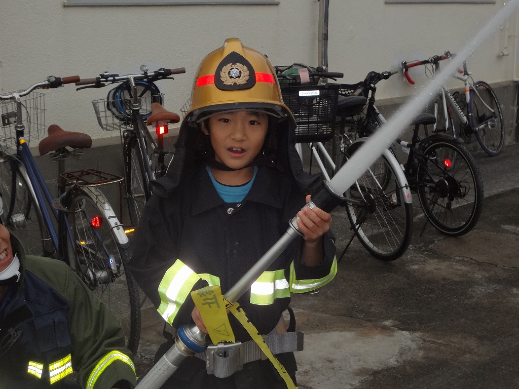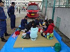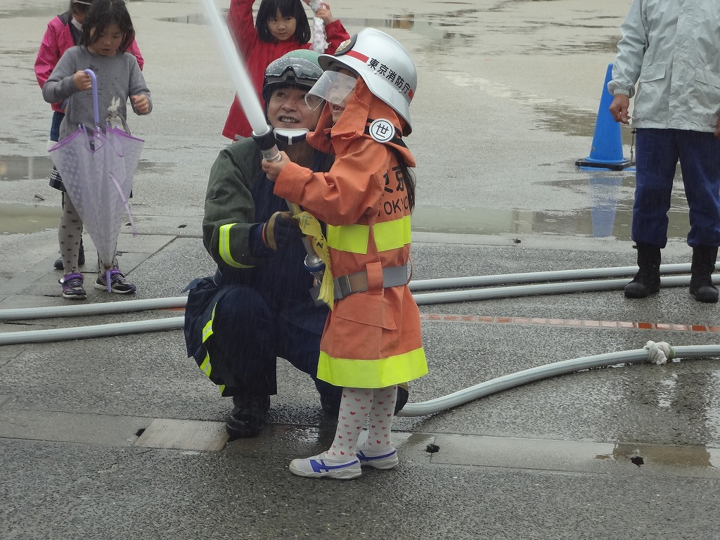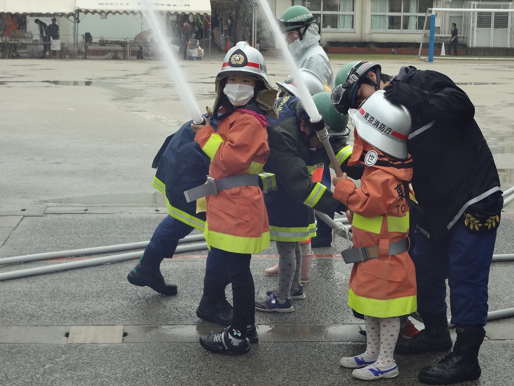 私たち12分団は、今年も「消火活動訓練とAED使ってみよう!」ブースでの参加。消火活動訓練は、学校のプールの貯水を水利にして積載車ポンプから40ミリホースでの消火訓練(体験)。子供用ですが本格的な防火服を着ての体験に大満足の子供たちのようでした。AEDも実際の講習会で使用するAEDと人形を使っての訓練(体験)です。心肺蘇生も一生懸命にやってくれました。