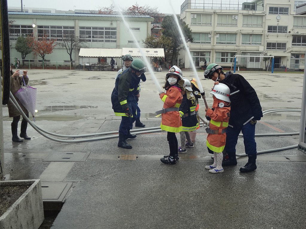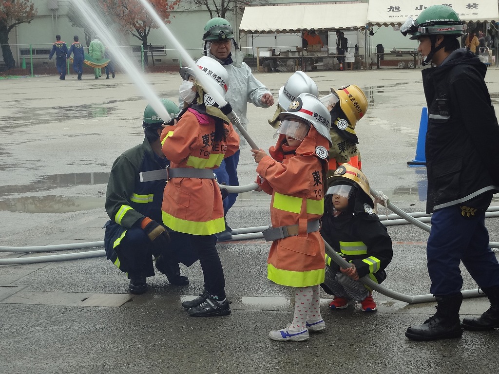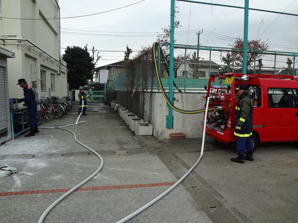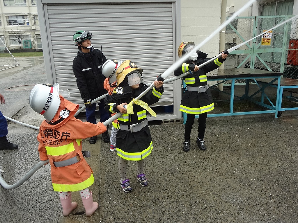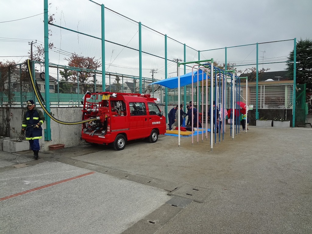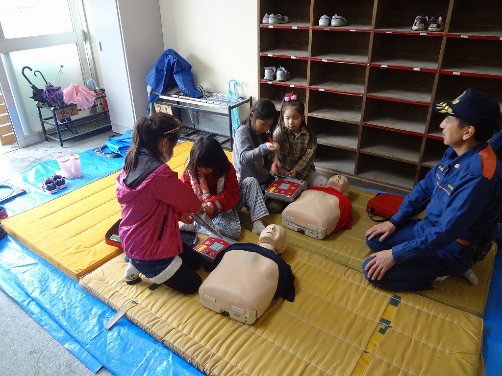 私たち12分団は、今年も「消火活動訓練とAED使ってみよう!」ブースでの参加。消火活動訓練は、学校のプールの貯水を水利にして積載車ポンプから40ミリホースでの消火訓練(体験)。子供用ですが本格的な防火服を着ての体験に大満足の子供たちのようでした。AEDも実際の講習会で使用するAEDと人形を使っての訓練(体験)です。心肺蘇生も一生懸命にやってくれました。
