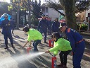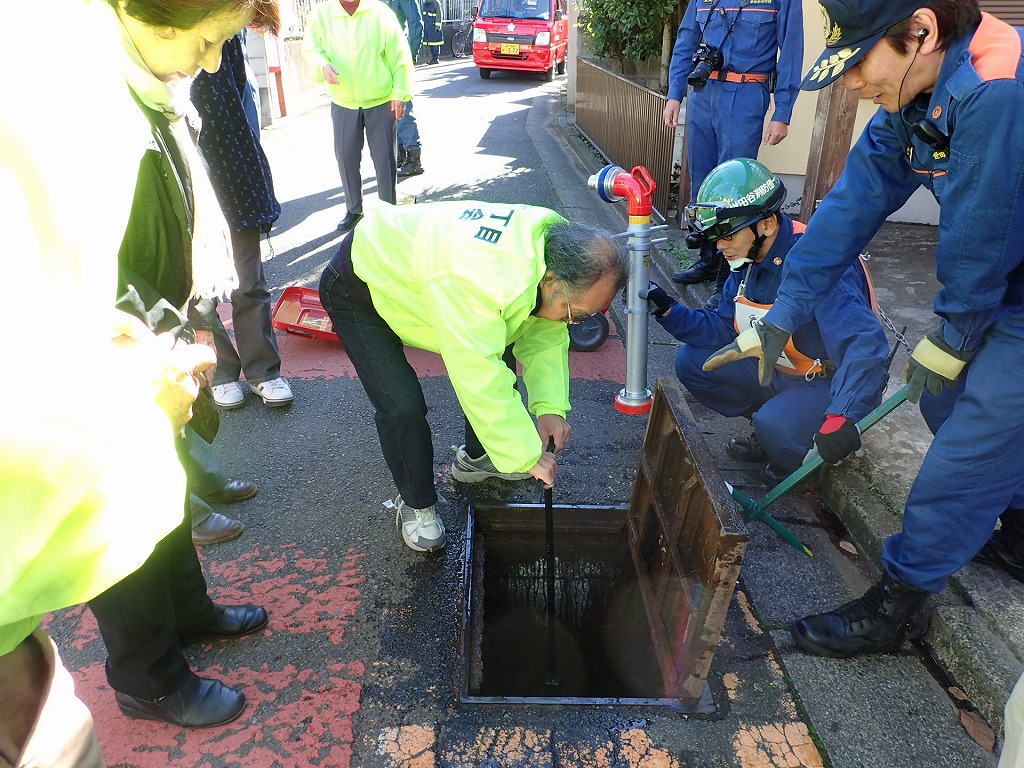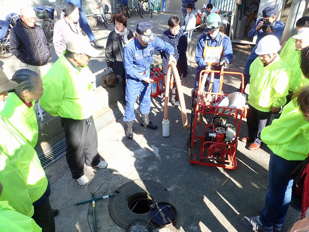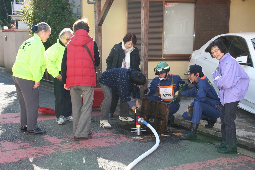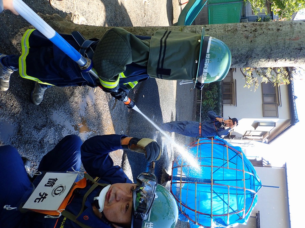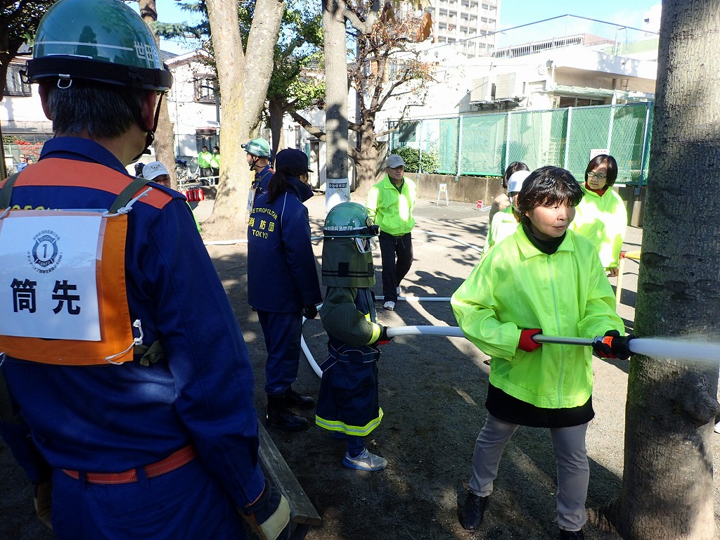 消防署員の指導による消火器を使った初期消火訓練では、『火事だ!』のかけ声とともに参加者全員で消火器の操作を行いました。またスタンドパイプを使用しての訓練では、菅沼部長をはじめ団員の指導の元で住民の多くにスタンドパイプからの放水を体験してもらいました。最後には、公園の地下にある水利の説明をして町会の格納庫に装備しているD級ポンプの取り扱いも一部紹介ができました。今後も新たな参加者が増え防災意識を高めることに役立てていていけることと思います。