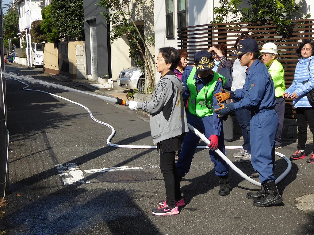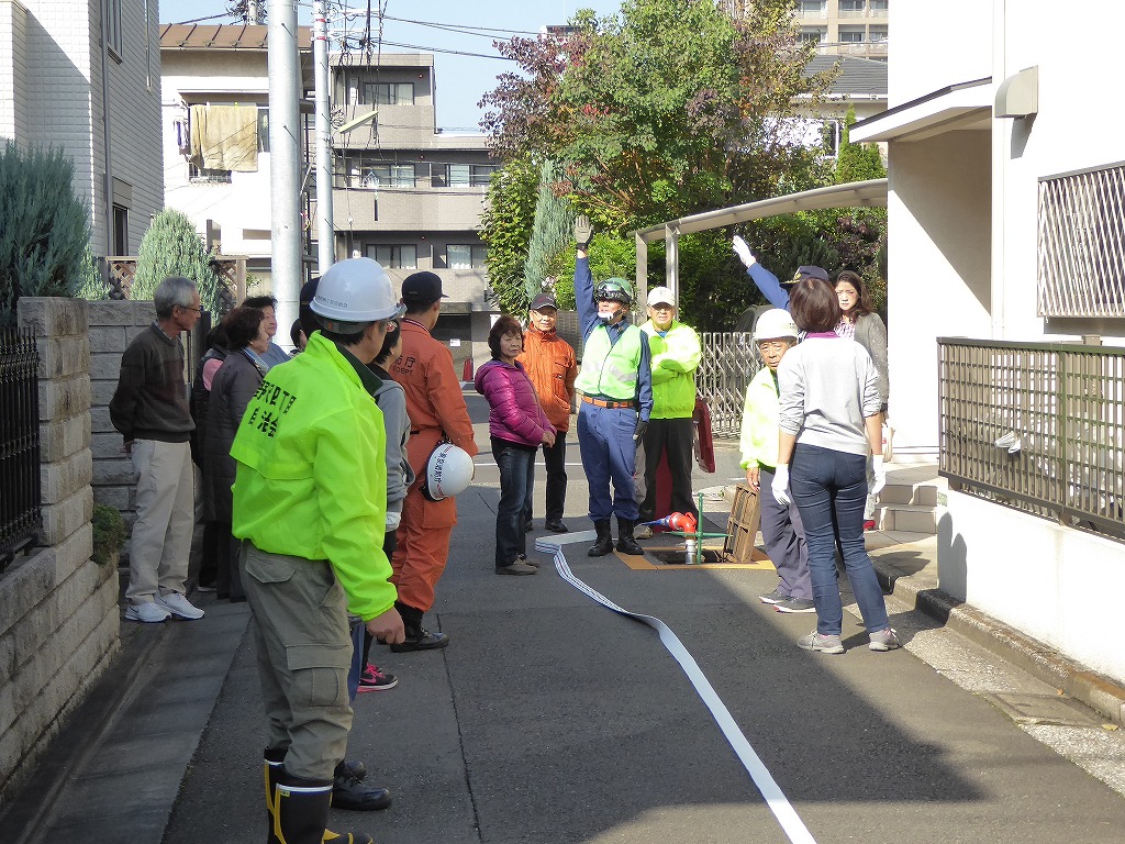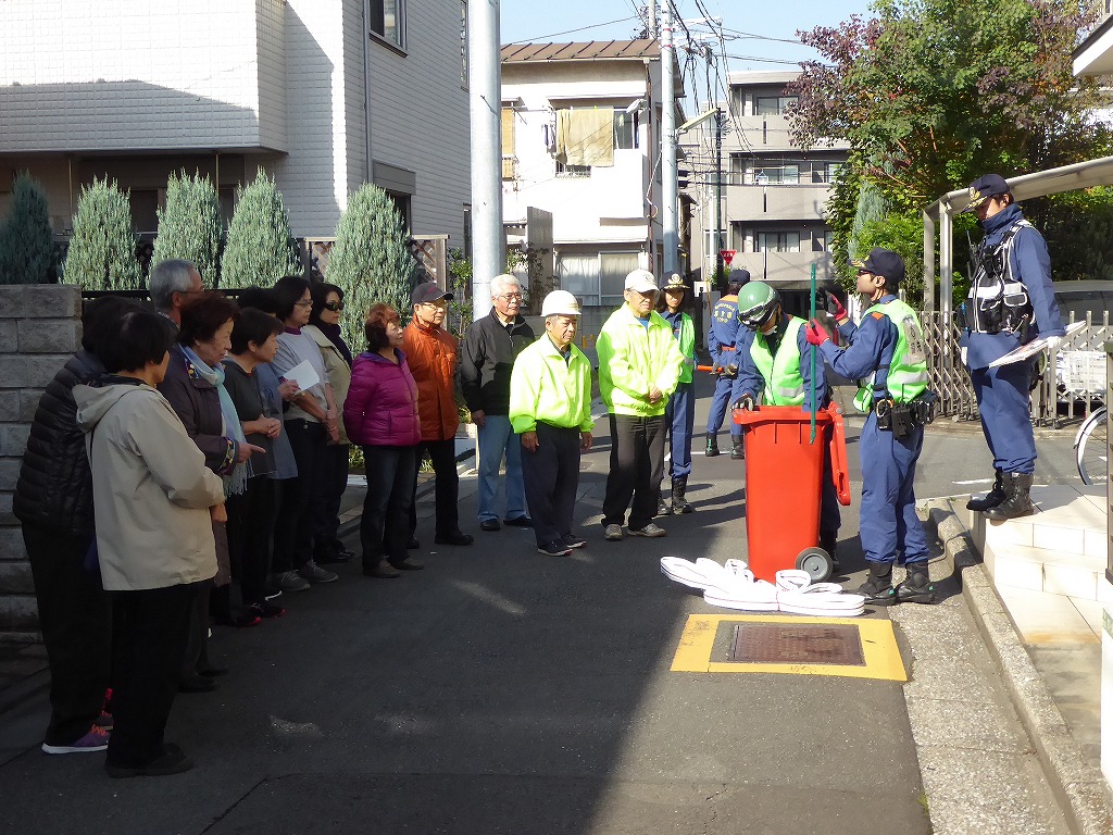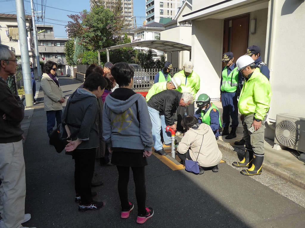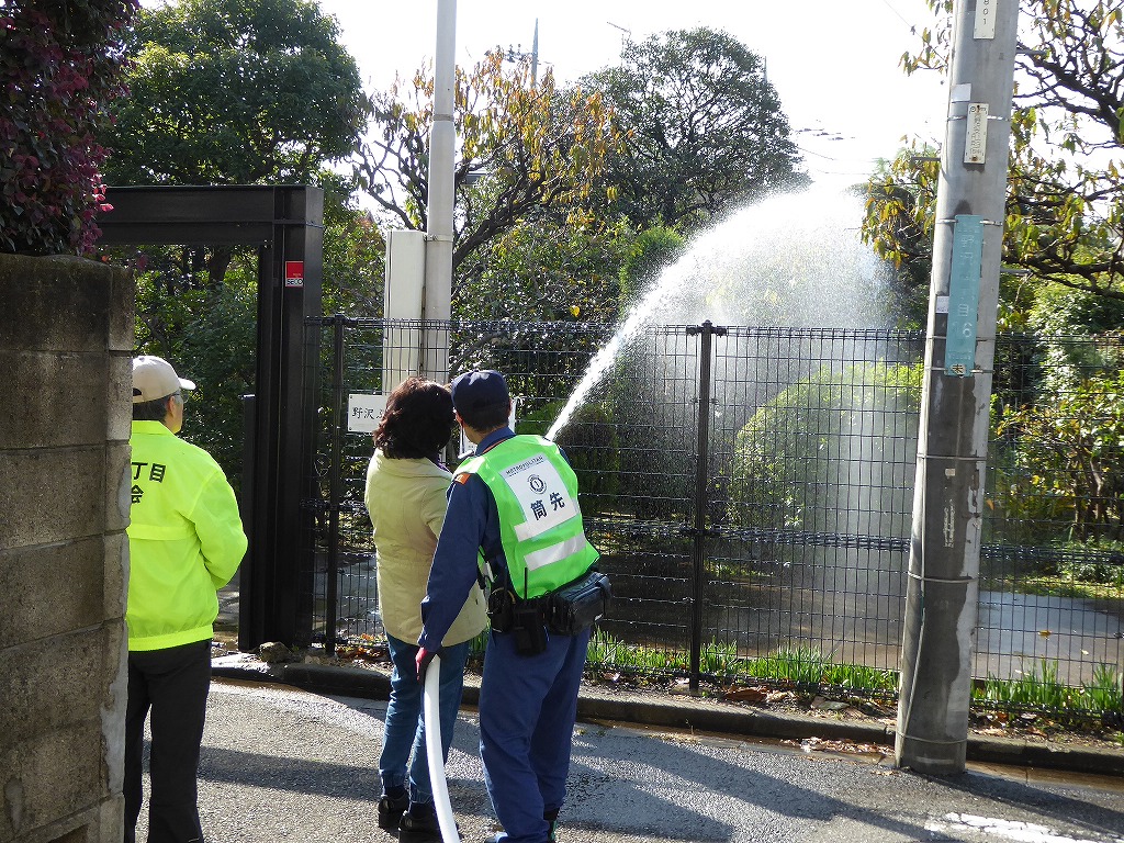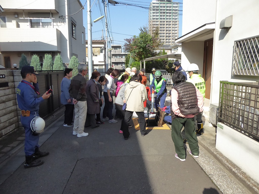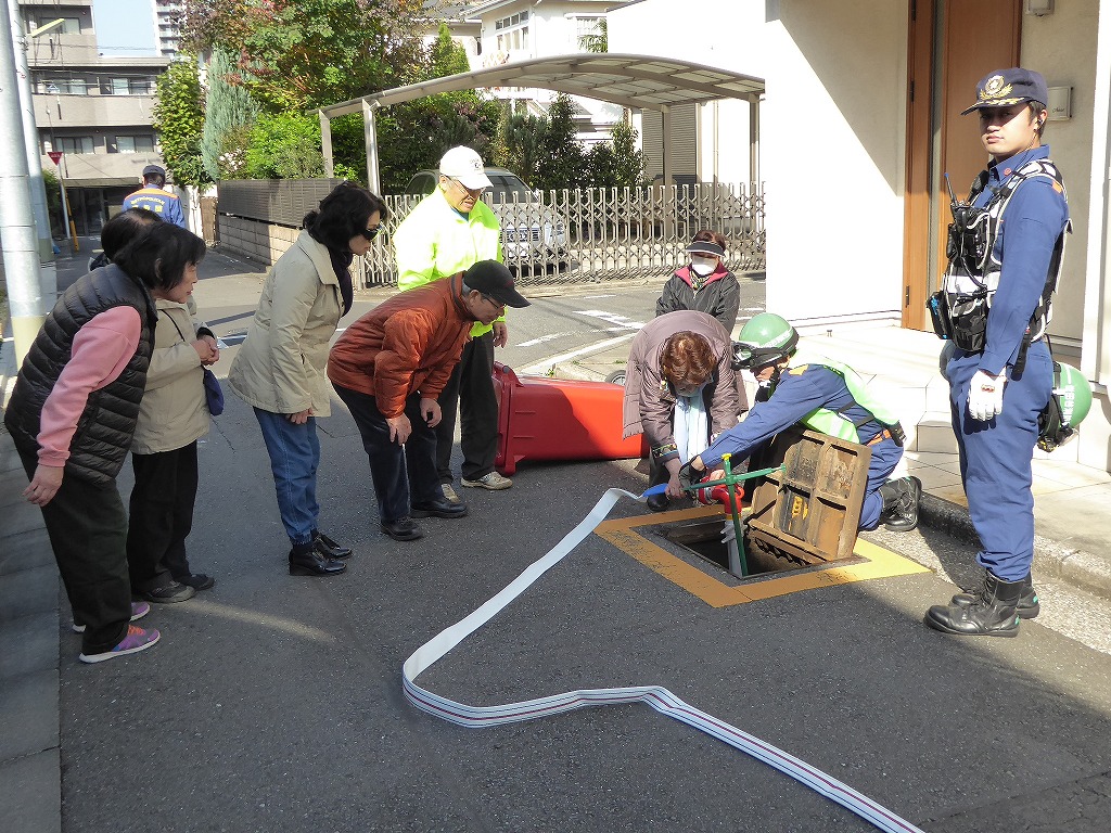 ■11月13日(日)野沢ふれあいの家周辺の消火栓を使用して、スタンドパイプを使用した初期消火訓練が実施されました。 野沢4丁目町会さんの訓練は久しぶりということも有り、全員の方に消火栓の蓋開け、スタンドパイプの設置、送水、放水と一通り体験して頂きました。 その後消火器の放水訓練、最後に近くにある丸い蓋の消火栓の開閉も確認して頂きました。