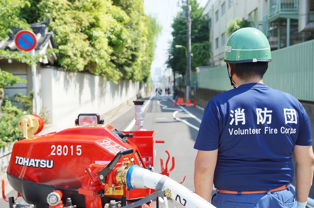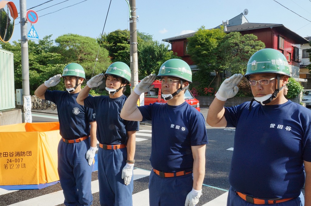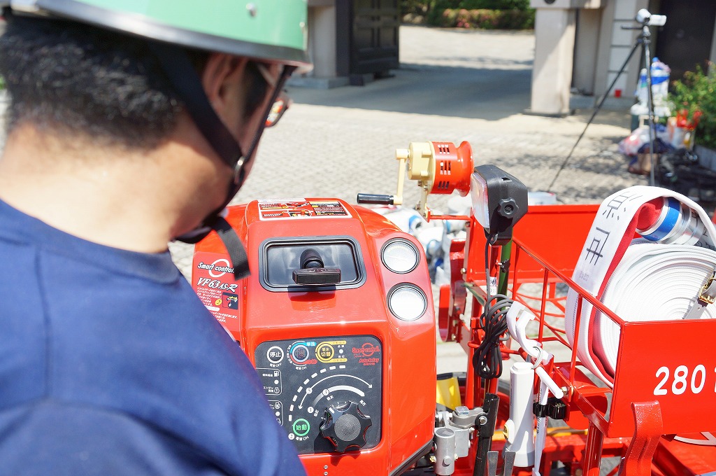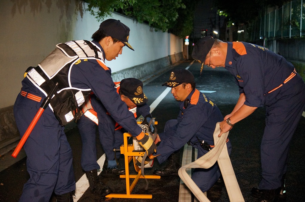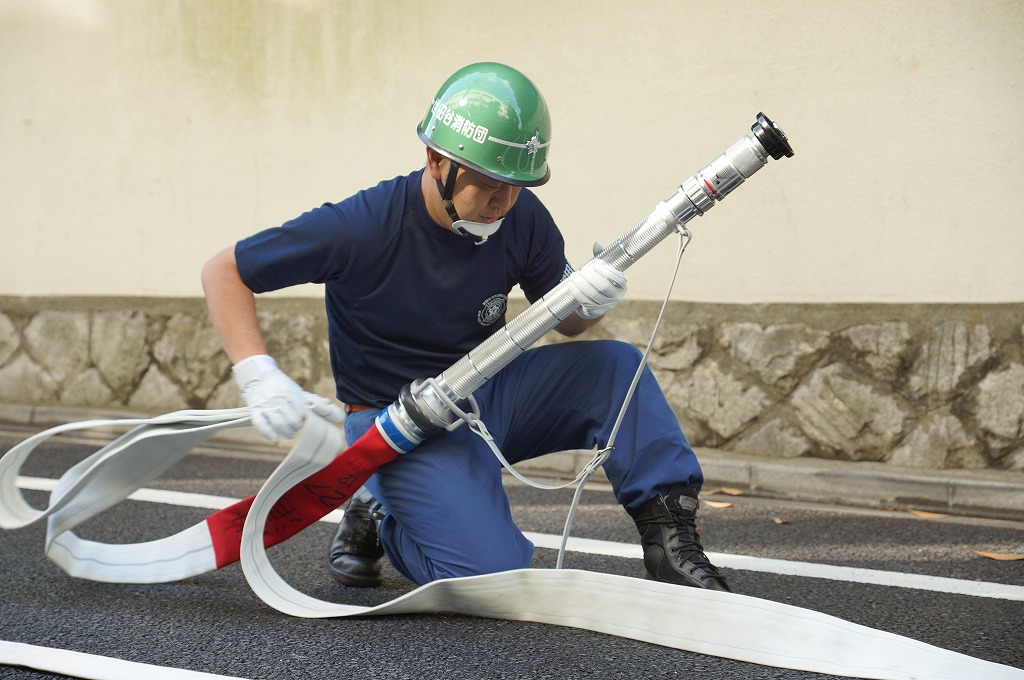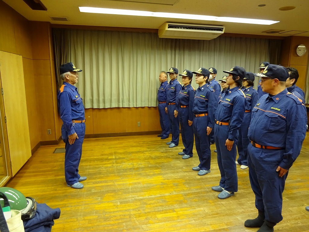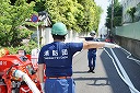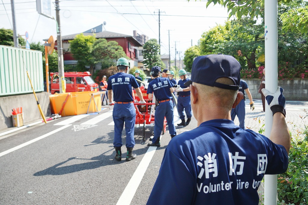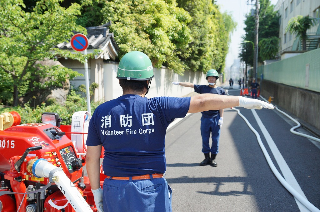 12分団の操法の訓練は、ポンプ機関・器具操作等 消火訓練はもちろん、「安全に危険個所を回避して通行頂く」という誘導訓練も含めています。