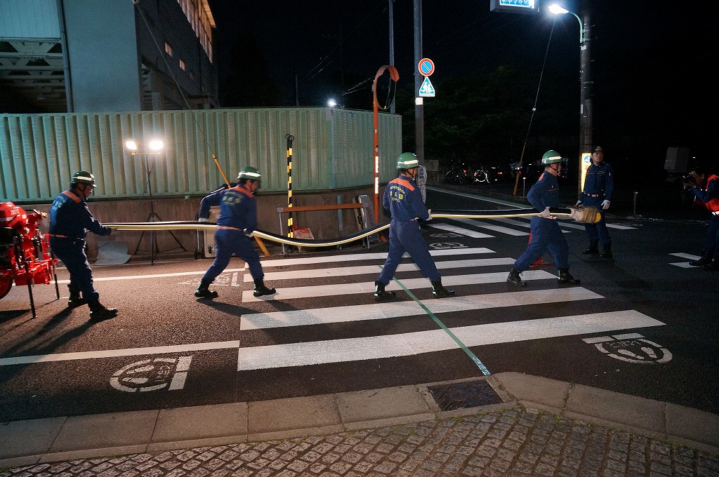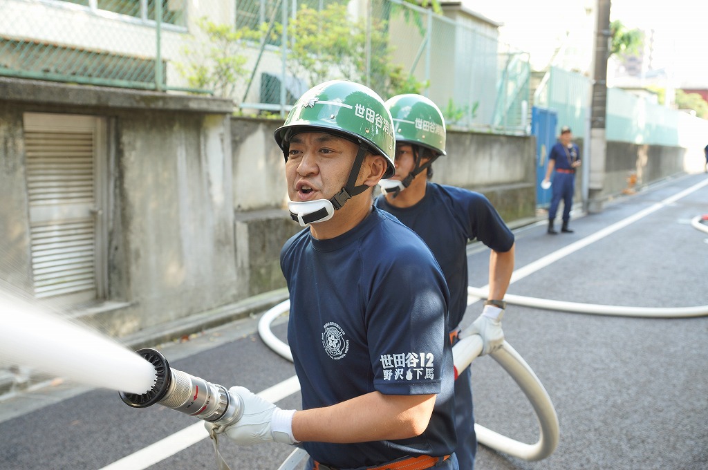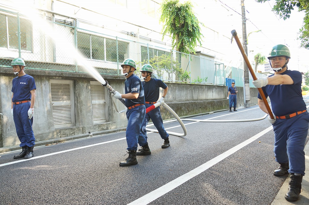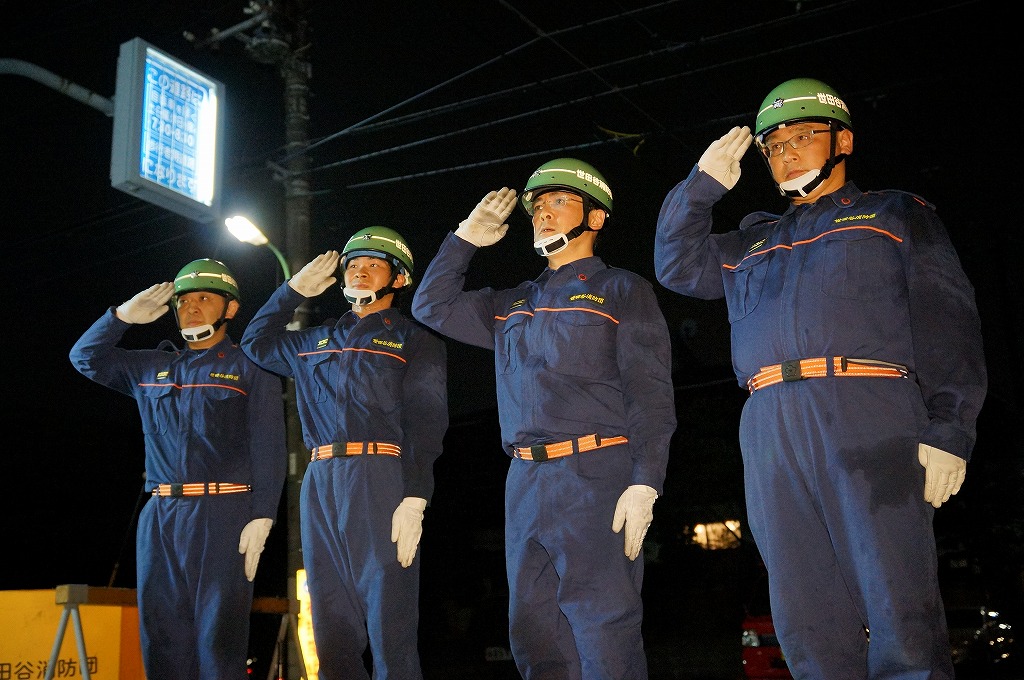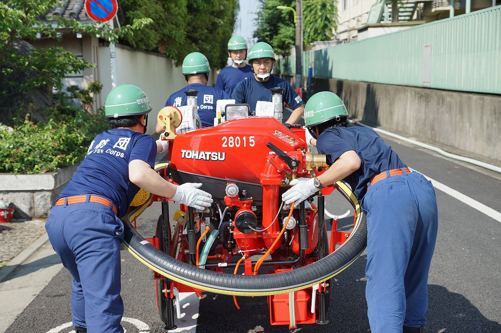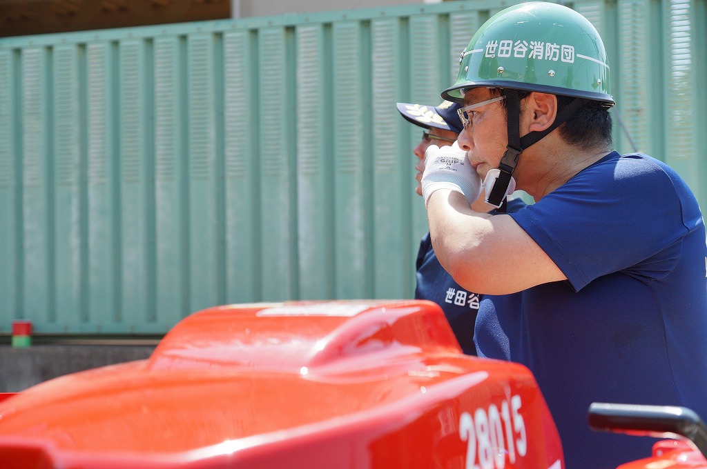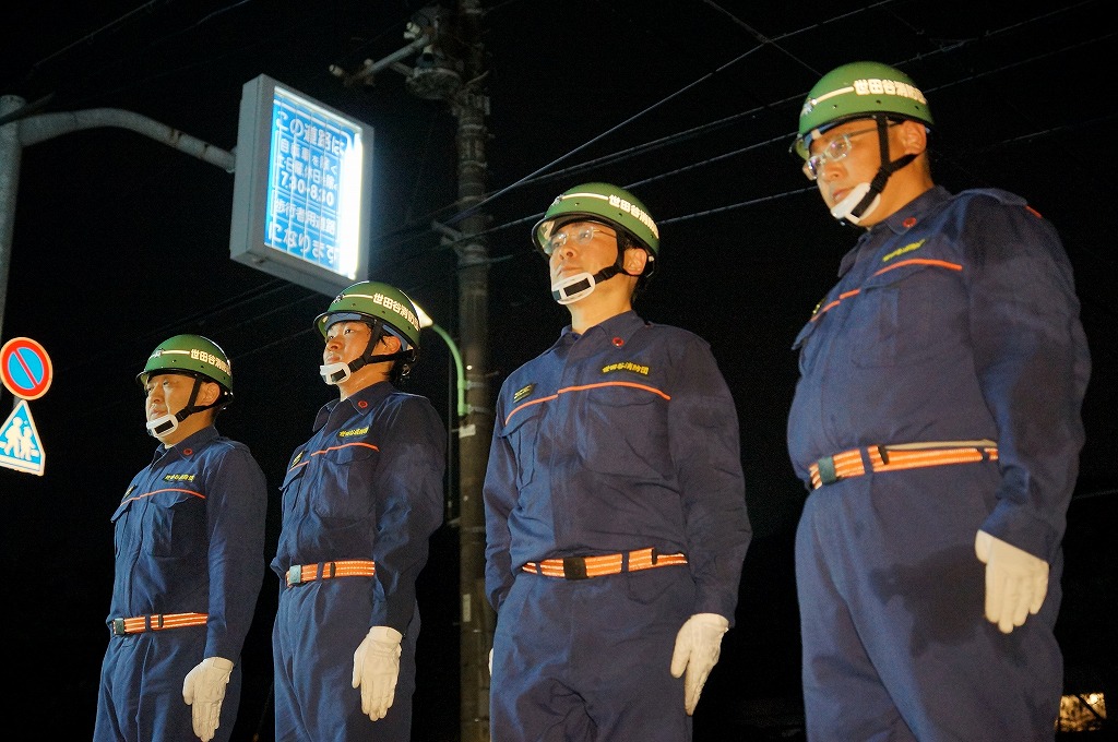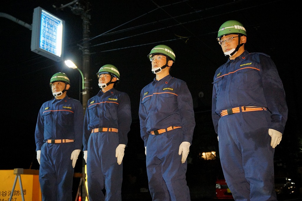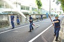 12分団の操法の訓練は、ポンプ機関・器具操作等 消火訓練はもちろん、「安全に危険個所を回避して通行頂く」という誘導訓練も含めています。