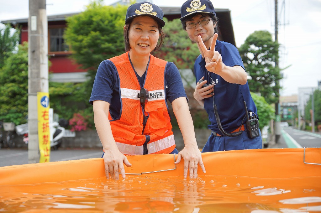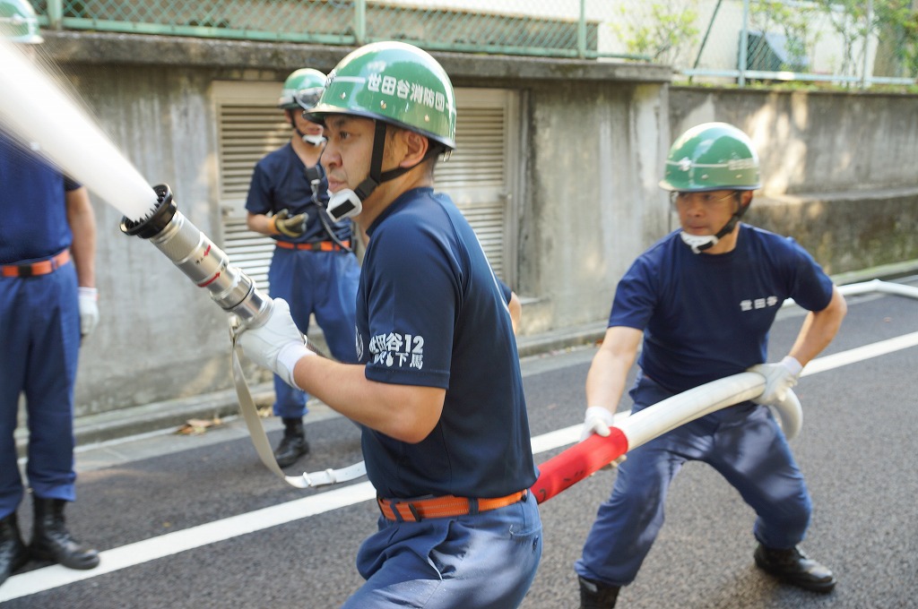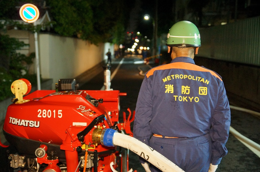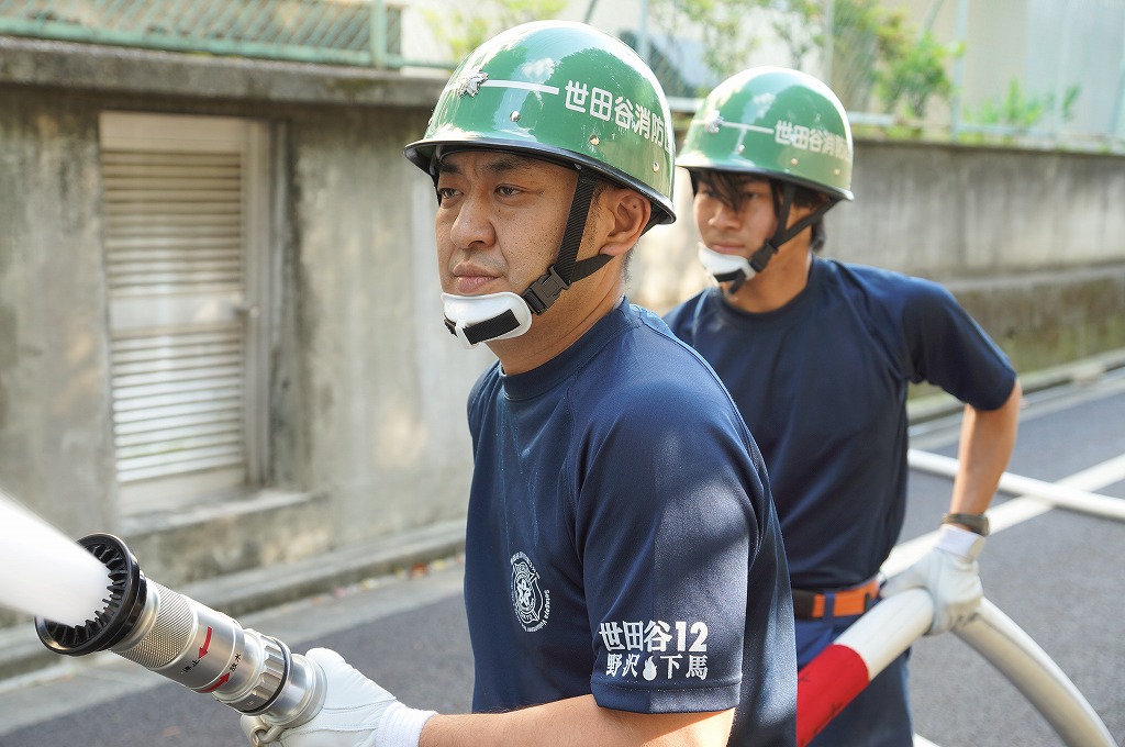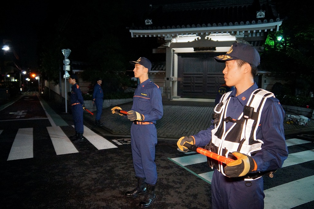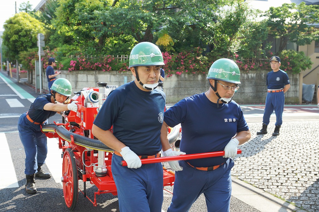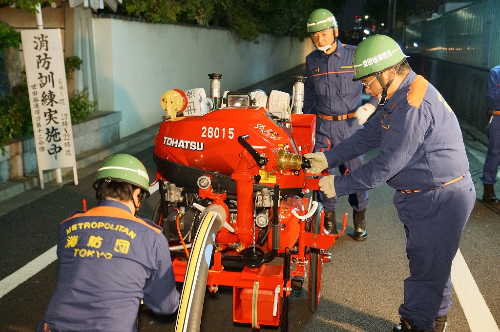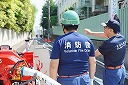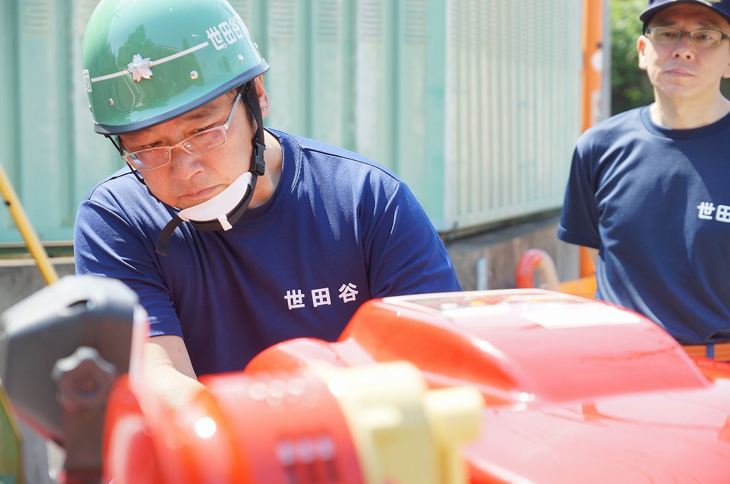 12分団の操法の訓練は、ポンプ機関・器具操作等 消火訓練はもちろん、「安全に危険個所を回避して通行頂く」という誘導訓練も含めています。